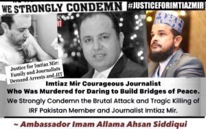 Ambassador Imam Allama Ahsan Siddiqui has extended Strongly Condemn the Brutal Attack and Tragic Killing of Our IRF Pakistan Member Journalist Imtiaz Mir.