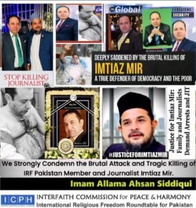 Ambassador Allama Muhammad Ahsan Siddiqui said that the Interfaith Commission for Peace & Harmony (ICPH) and International Religious Freedom Roundtable for Pakistan (IRF Pakistan) demand that the culprits be arrested and the family of the journalist be given compensation. In light of these alarming circumstances, he further said I urgently appeal to your esteemed organizations to press, electronic media the Government of Pakistan to conduct a transparent, impartial, and independent investigation into the murder of Imtiaz Mir. He said those responsible regardless of their influence or political ties must be brought to justice.We stands in full solidarity with journalists, religious leadership and firmly with his family in this difficult time. He said that the killing of a journalist for performing his duty is not just an attack on one individual but on the entire principle of press freedom and truth-seeking. He said that Imtiaz Mir’s murder exposes Sindh’s lawlessness and failure to protect journalists, religious leaders and others. He was passionate, fearless, and committed to giving a voice to the voiceless. The government seems to have failed in providing protection to the religious leaders, journalist, women’s, taran’s fraternity. We call upon the Government of Sindh, the Inspector General of Sindh Police, and other senior authorities to ensure a transparent, impartial, and fair investigation into this matter so that the true facts may come to light.