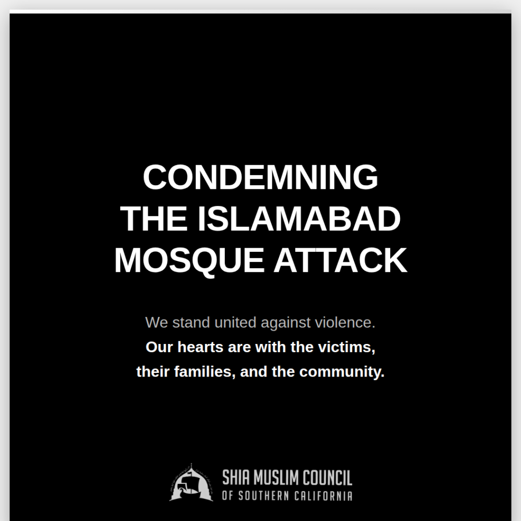 On behalf of the Shia Muslim Council and our entire community, we utterly condemn the horrific suicide bombing that struck the Khadijah al-Kubra Mosque in the Tarlai Kalan area of Islamabad during Friday (Jumu’ah) prayers on 6 February 2026. This senseless act of violence, claiming the lives of at least 31 innocent worshippers and injuring more than 169 others — is an atrocity that grieves us all and shakes the conscience of humanity.