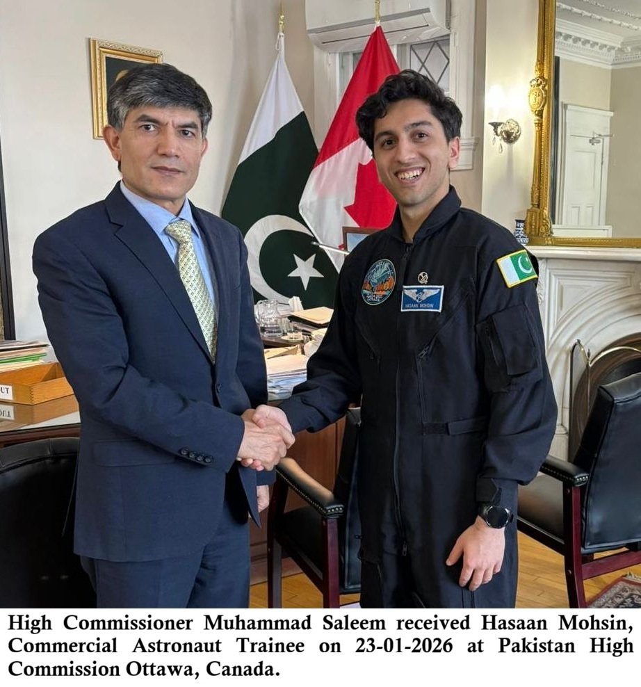 High Commissioner Muhammad Saleem received Mr. Hasaan Mohsin, Commercial Astronaut Trainee with the International Institute for Astronautical Sciences, a renowned centre of excellence for astronautics and bioastronautics training, today.