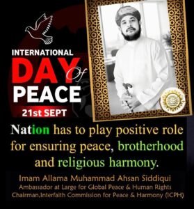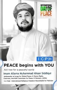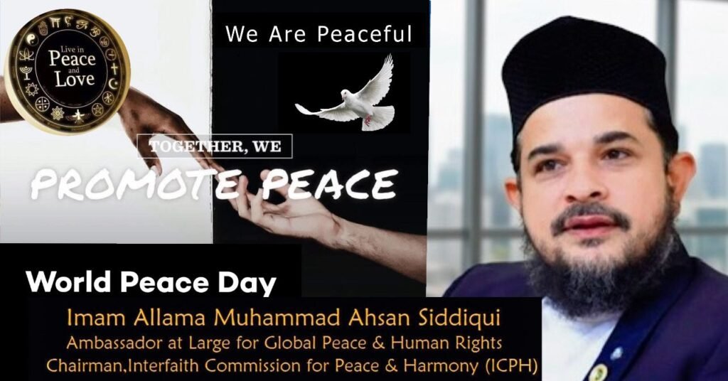 Ambassador at Large for global Peace and Human Rights Imam Allama Ahsan Siddiqui said as the International Day of Peac on 21 September a call to lay down division, embrace humanity, and strengthen the bonds that hold our communities together, we take this meaningful step toward building a world where peace, respect, and unity prevail. the message of peace and the importance of embracing it in our daily lives. He said ICPH is committed to promoting multilateralism and tolerance for peace. we Interfaith Commission for Peace & Harmony (ICPH) reaffirm our commitment to supporting peaceful dialogue as a cornerstone for conflict resolution, providing a neutral platform for dialogue based on mutual respect, understanding.