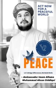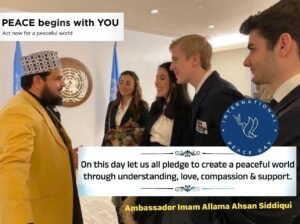 His Eminence Ambassador at Large for global Peace and Human Rights Imam Allama Ahsan Siddiqui said that on 21 September “World Peace Day”, we celebrate the power of unity, compassion, and dialogue in creating a peaceful world. Every small act of kindness brings us closer to a future filled with harmony and hope. We must teach future generations the values of understanding and cooperation, equipping them with the tools to resolve conflict peacefully. He urges all young individuals to be proactive, positive societal agents, joining the movement to achieve the SDGs (Sustainable Developmental Goals) and thereby building enduring peace. SDG 16 Peace, Justice and strong institutions. Peace is not merely the absence of war, but the presence of justice, equality, and compassion in the hearts of all people.