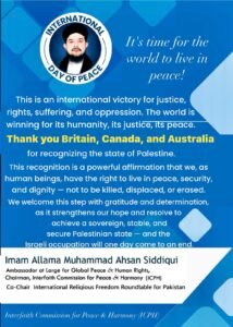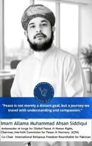 PAKISTAN : In times of global unrest, we turn inward to our spiritual practice for guidance. We recognize the divine light within every individual on this planet and affirm our deep connection with all of humanity. The Co-Chair Pakistan, International Religious Freedom Roundtable for Pakistan (IRF Pakistan) and the Chairman, Interfaith Commission for Peace & Harmony (ICPH), led by His Eminence Ambassador at Large for global Peace and Human Rights Imam Allama Ahsan Siddiqui. Peace is a catalyst for development and the achievement of the global goals. Without peace, the fundamental rights of all people and the protection of the planet is at risk. We joins the global community in commemorating the International Day of Peace under the theme “Act Now for a Peaceful World, reminds us that peace begins with action big or small. a powerful reminder that peace can’t wait, and it starts with us.