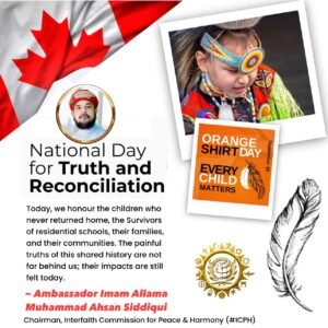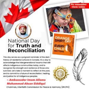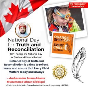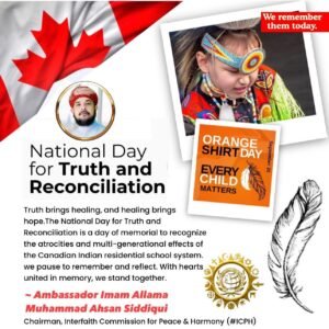 CANADA : The painful truths of this shared history are not far behind us; their impacts are still felt today. The Co-Chair Pakistan, International Religious Freedom Roundtable for Pakistan (IRF Pakistan) and the Interfaith Commission for Peace & Harmony (ICPH), led by His Eminence Ambassador at Large for global Peace and Human Rights Imam Allama Ahsan Siddiqui message On Canada National Day for Truth and Reconciliation , today is the National Day for Truth and Reconciliation. It occurs every year on September 30. It’s a time to reflect on Canada’s history and the impact of residential schools.