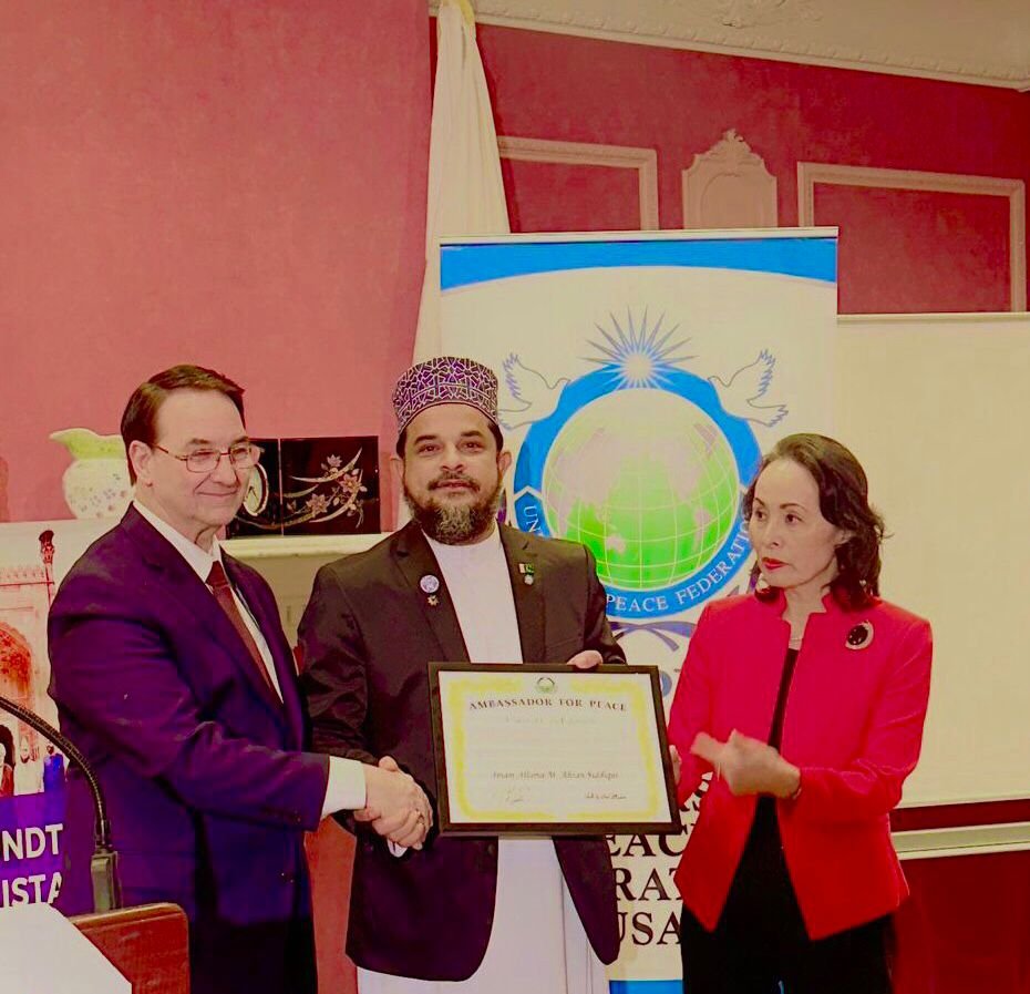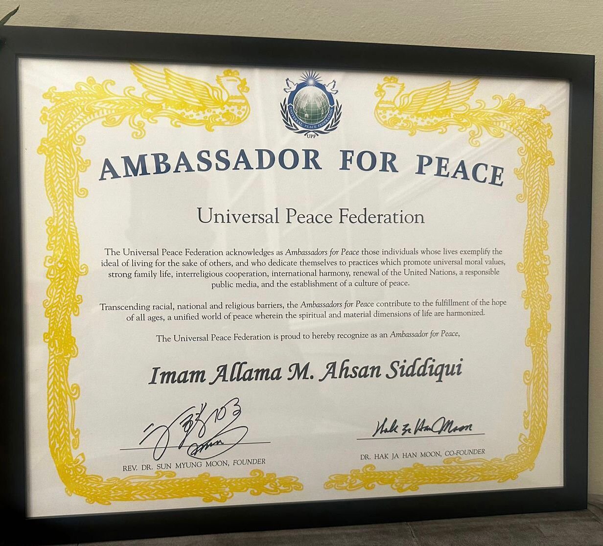 UPF appointed Ambassador Imam Allama Muhammad Ahsan Siddiqui, a as Ambassador for Peace in recognition of his interfaith ,religious freedom, love, global peace initiatives and activities and presented him with a Certificate as “Ambassador For Peace Award “. The Universal Peace Federation commends Imam Allama Muhammad Ahsan Siddiqui for her outstanding contributions, recognizing her as an Ambassador for Peace, and celebrates her role in harmonizing the spiritual and material dimensions of life towards a unified world of peace.