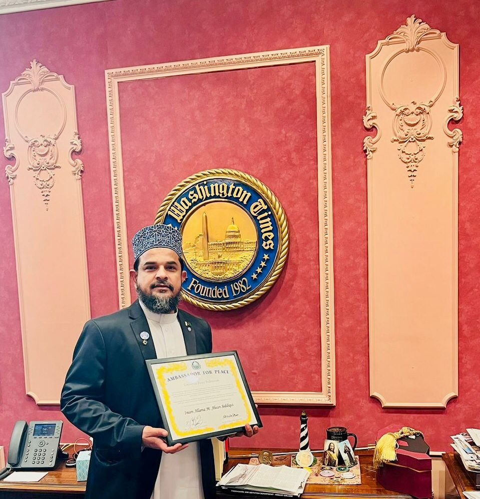 WASHINGTON D.C.: The Universal Peace Federation (USA) proudly announces the recognition of Imam Allama Muhammad Ahsan Siddiqui as an a “Ambassador For Peace Award “, an esteemed acknowledgment bestowed upon individuals whose lives epitomize the ethos of selfless service and dedication to fostering universal moral values. His exceptional contributions to society have garnered international recognition, as he was recently honored with the United Nations Universal Peace Federation (UPF) distinguished award was presented by Dr. Michael Jenkins President, UPF International, Chairman, UPF North America and Mrs. Tomiko Duggan, Senior Vice President, Universal Peace Federation (UPF) USA. The ceremony drew the attendance of numerous faiths and community leaders, fellow Ambassadors, and esteemed figures from clergy and academia worldwide on February 03, 2024 at the Washington Times United States Headquarters in Washington DC.